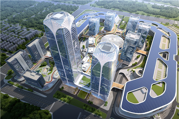 該項目由外圍市場商貿環(huán)和內部商辦活力環(huán)組成,其中內部商辦活力環(huán)包含七棟寫字樓及飄帶式的商業(yè)裙房環(huán)抱中心數(shù)字大腦,七棟辦公樓由70米逐步攀升100米,整體形象呈現(xiàn)七星還珠、步步升騰的態(tài)勢。