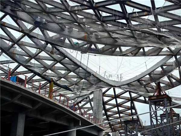 該項(xiàng)目位于中國珠江出??冢偨ㄖ娣e9.35萬平方米,屋面平面長170米,寬150米,建筑高度50.9米,為雙向懸垂三角形網(wǎng)格結(jié)構(gòu),最大跨度達(dá)75米。其網(wǎng)格單元雙向懸垂三角形的設(shè)計(jì)在重力作用下,網(wǎng)格自然懸垂,使上千噸的鋼結(jié)構(gòu)呈現(xiàn)出連續(xù)波浪般輕盈的造型,還原了“千帆競渡,科技遠(yuǎn)航”的設(shè)計(jì)理念,不僅富有動態(tài)美,更體現(xiàn)了建筑設(shè)計(jì)與施工的挑戰(zhàn)性和創(chuàng)新性。